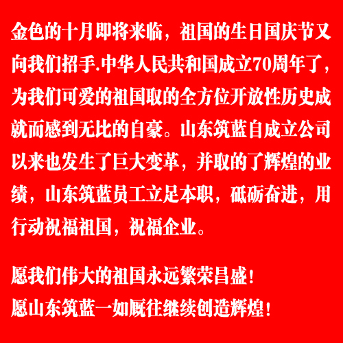 山東筑藍(lán)人踏實(shí)認(rèn)真 執(zhí)著高效 ,多年來(lái)穩(wěn)步發(fā)展,奮斗不息,不斷創(chuàng)新與時(shí)俱進(jìn),歲月凝聚著我們的力量,迎著朝陽(yáng)放飛夢(mèng)想,山東筑藍(lán)的旗幟在前進(jìn)的道路上飄揚(yáng),五星紅旗為我們指引了方向。